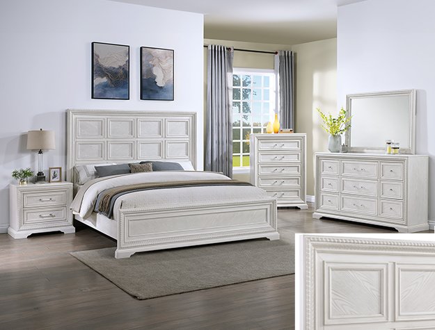 Introducing a bedroom collection that brings a breath of fresh sophistication to any living space. This suite boasts a bright, antique white finish that immediately brightens and opens up a room, providing a versatile foundation for any decor style. The bed’s commanding headboard stands as a stately centerpiece, with architectural paneling details that convey a sense of sturdy elegance. Storage needs are gracefully met by the dresser and chest, each accented with refined drawer pulls that offer a subtle contrast and easy access.