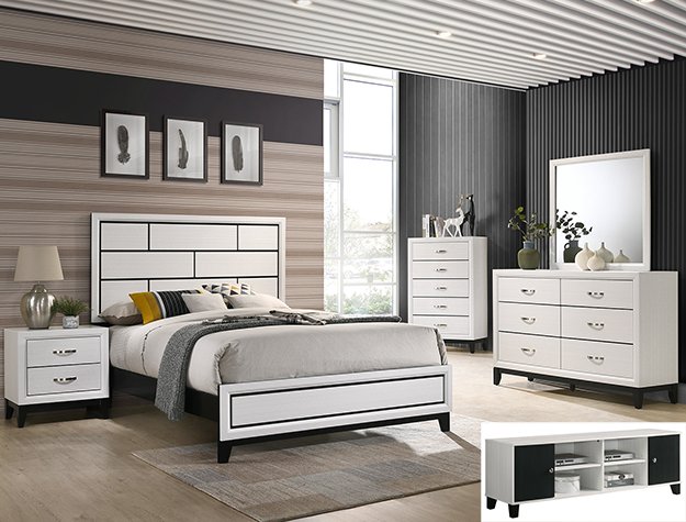 This contemporary bedroom set presents a crisp, clean look with its white finish and contrasting dark accents. The simple, straight lines and subtle details give it a modern edge. The bed features a paneled headboard that makes a statement without overwhelming the space. The accompanying pieces, including a six-drawer dresser, a five-drawer chest, and a two-drawer nightstand, provide ample storage with a streamlined silhouette. A matching mirror adds functionality and completes the look, creating a cohesive and stylish bedroom environment. This set is perfect for those who appreciate understated style and practical design.